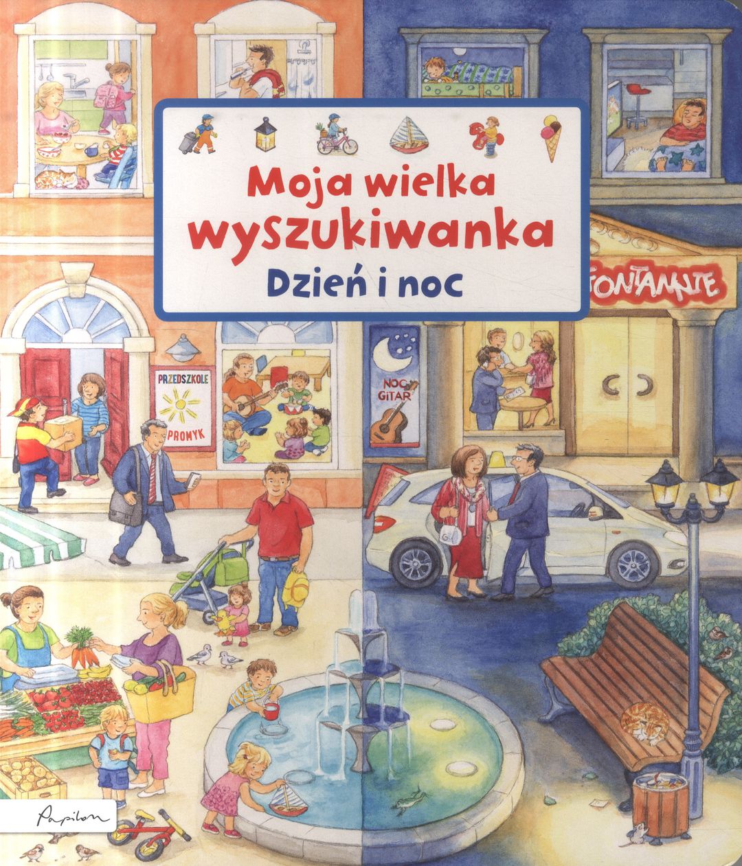 Dla tych, którzy lubią wiedzieć więcej o porach dnia. Dla tych, którzy chcą poznawać świat. Dla tych, którzy cieszą się, wyszukując szczegóły na kolorowych, pełnych detali ilustracjach. 11 plansz ukazujących dziesiątki sytuacji z codziennego życia. Obok każdej planszy krótkie, przystępne informacje o przedstawionym miejscu oraz nazwy pojedynczych elementów przy obrazkach zachęcających do zabawy w wyszukiwanie.